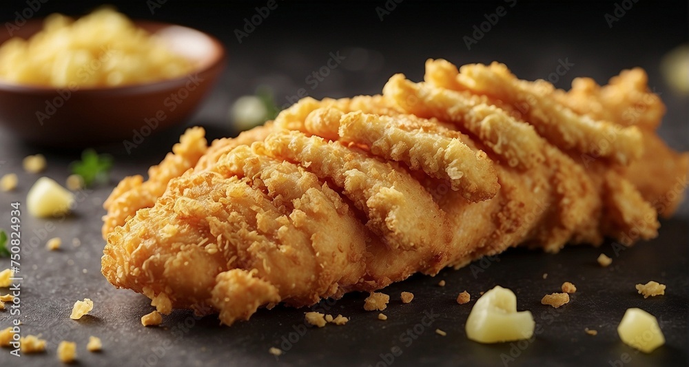 Craft a close-up photograph of a single crispy chicken strip, capturing ...