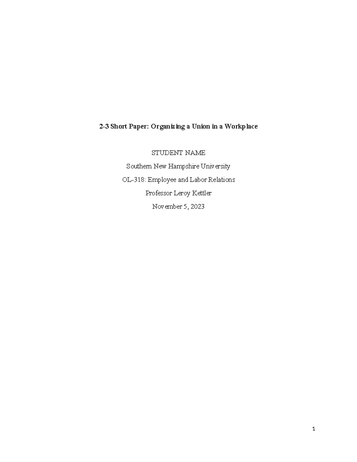 2-3 Short Paper Organizing a Union in a Workplace -3 Short Paper ...