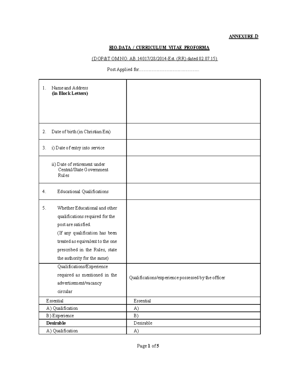 CURRICULUM VITAE PROFORMA FOR POST APPLICATION - ANNEXURE D - Studocu