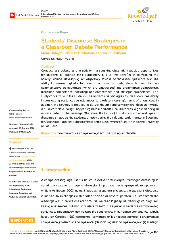 (PDF) Students’ Discourse Strategies in a Classroom Debate Performance