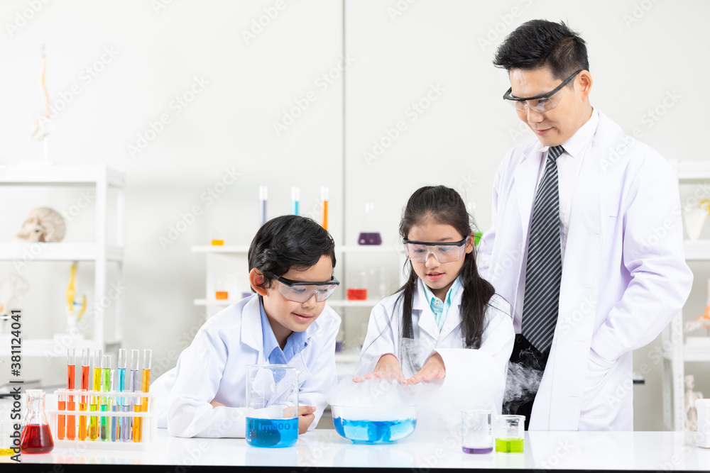 Science teacher testing a chemical experiment with child students in ...