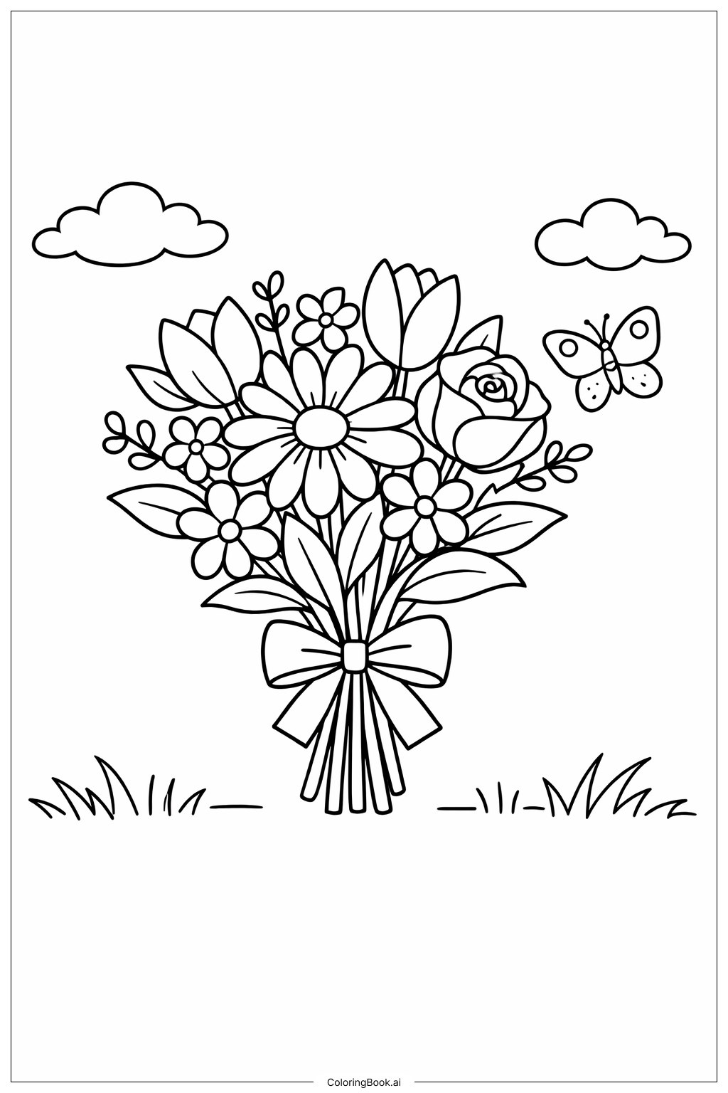 Bouquet Of Flowers With Butterfly Coloring Page (Free PDF&PNG Printable)