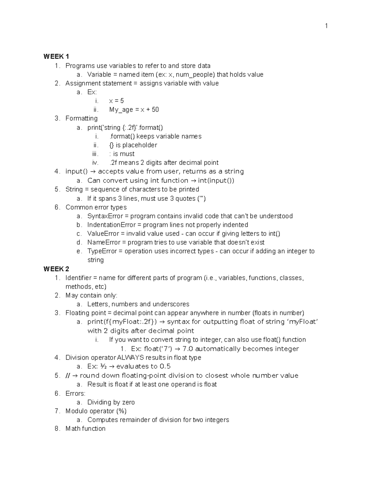 Exam 2 study - lecture notes (by week) - WEEK 1 Programs use variables ...
