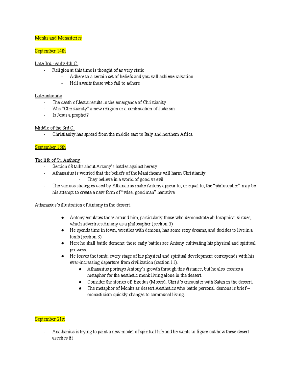 Med studies lecture notes - Monks and Monasteries September 14th Late ...