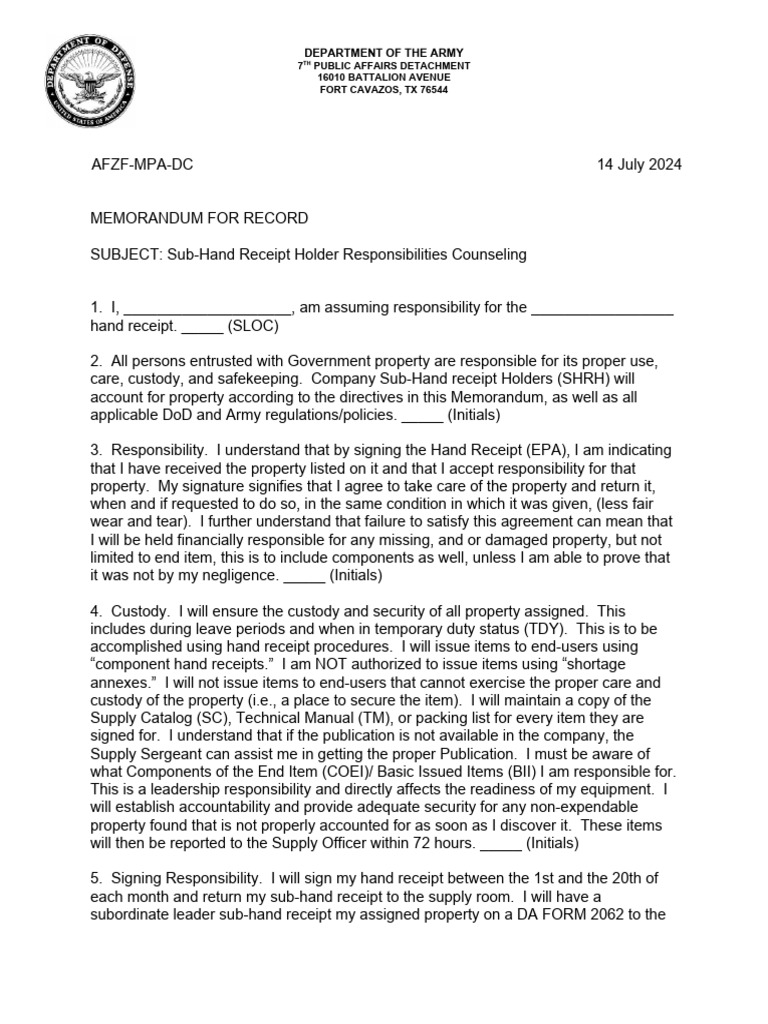 Hand Receipt Holder Counseling.docx - DEPARTMENT OF THE ARMY ...