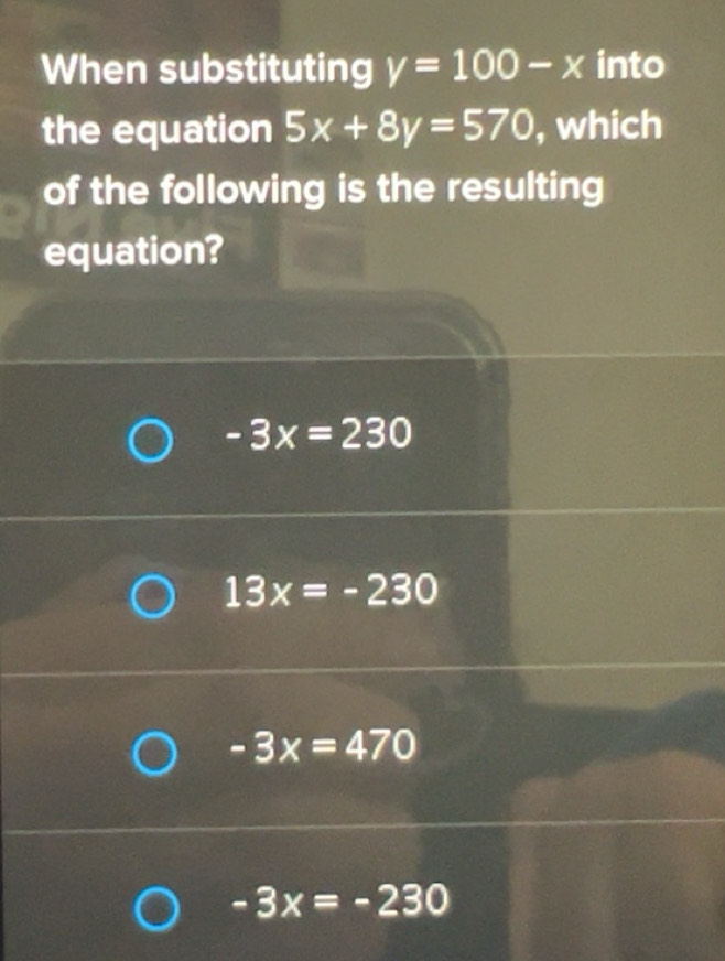 Solved: When substituting y=100-x into 5x+8y=570 , which of the ...