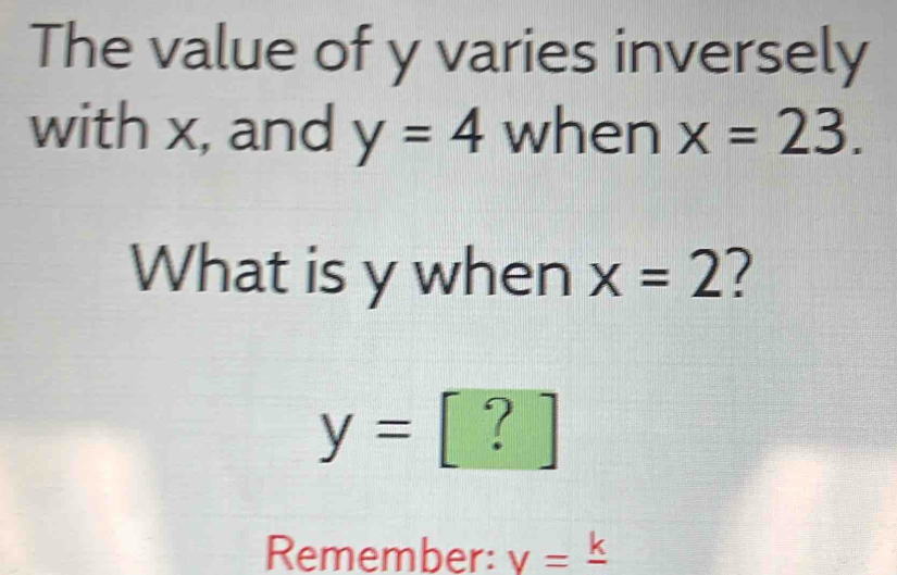 Solved: The value of y varies inversely with x, and y=4 when x=23. What ...