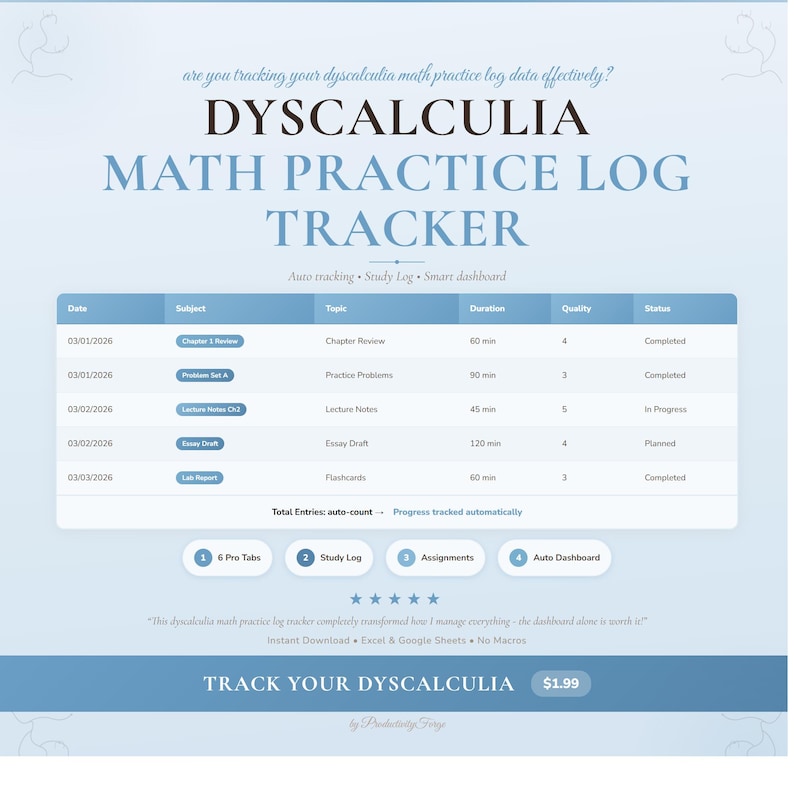 Dyscalculia Math Practice Log Tracker | Google Sheets Excel Spreadsheet ...