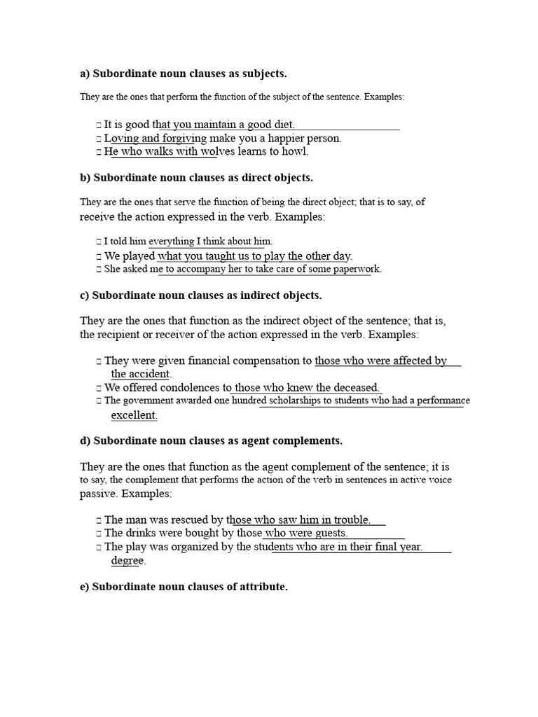 Noun Subordinate + Exercises | PDF | Clause | Subject (Grammar)