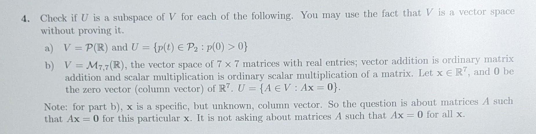 Solved 4. Check if U is a subspace of V for each of the | Chegg.com
