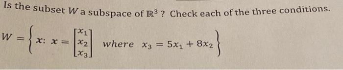 Solved Is the subset W a subspace of R3 ? Check each of the | Chegg.com
