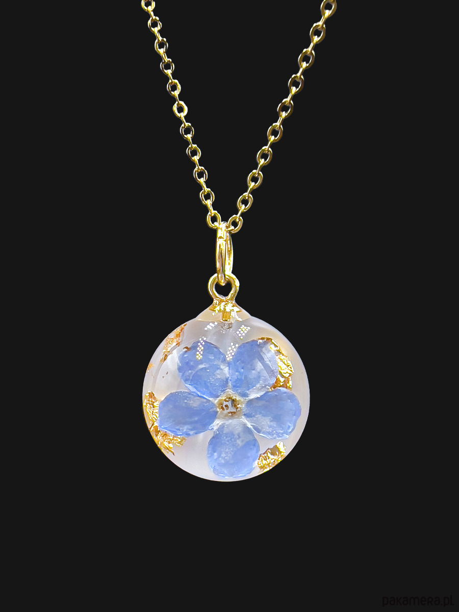 Subtelny naszyjnik z niezapominajką na białym tle - Pakamera.pl