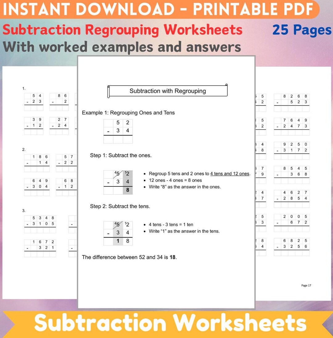 Printable Subtraction Regrouping Tutorial Worksheet Difference Revision ...