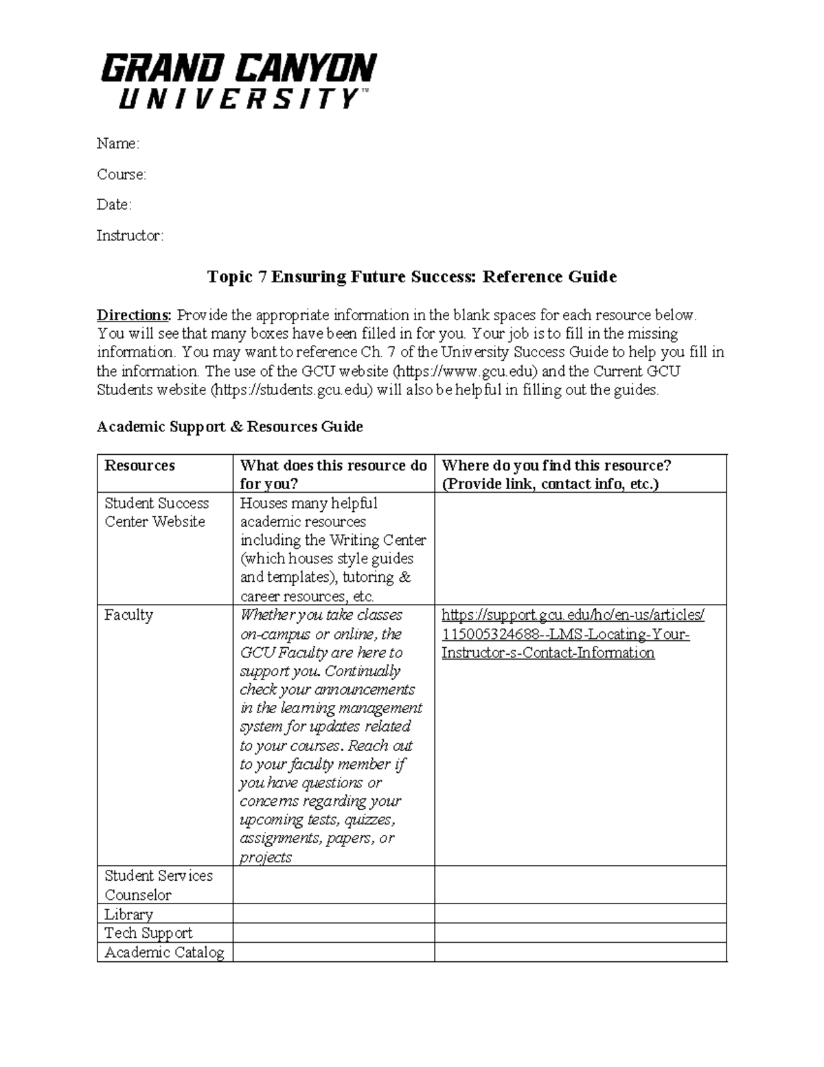 Ensuring Future Success Reference Guide T7 - Name: Course: Date ...