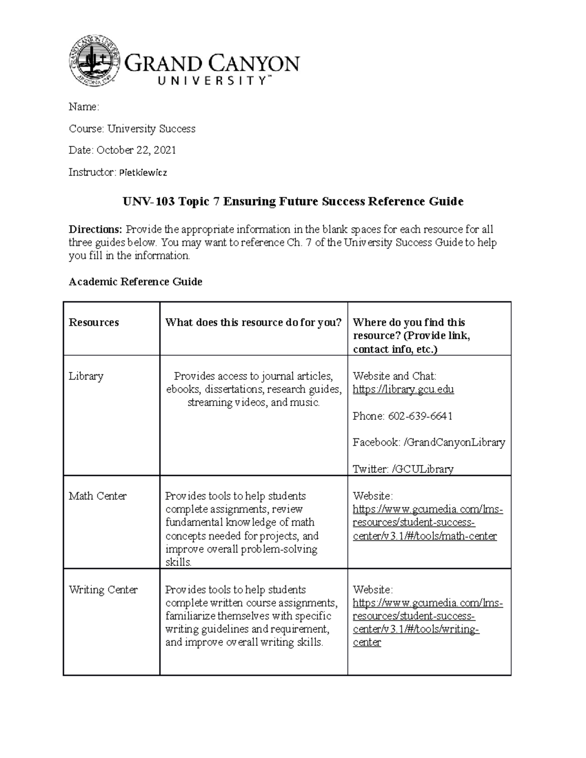 UNV 103 - Ensuring Future Success Reference Guide.docx - Name ...