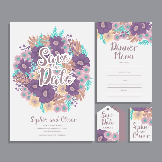 Elegant floral wedding invitation and menu template set with watercolor ...