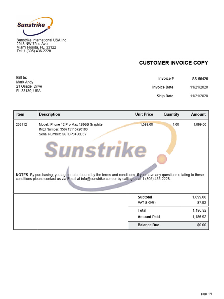Sunstrike International Invoice 2020 | PDF
