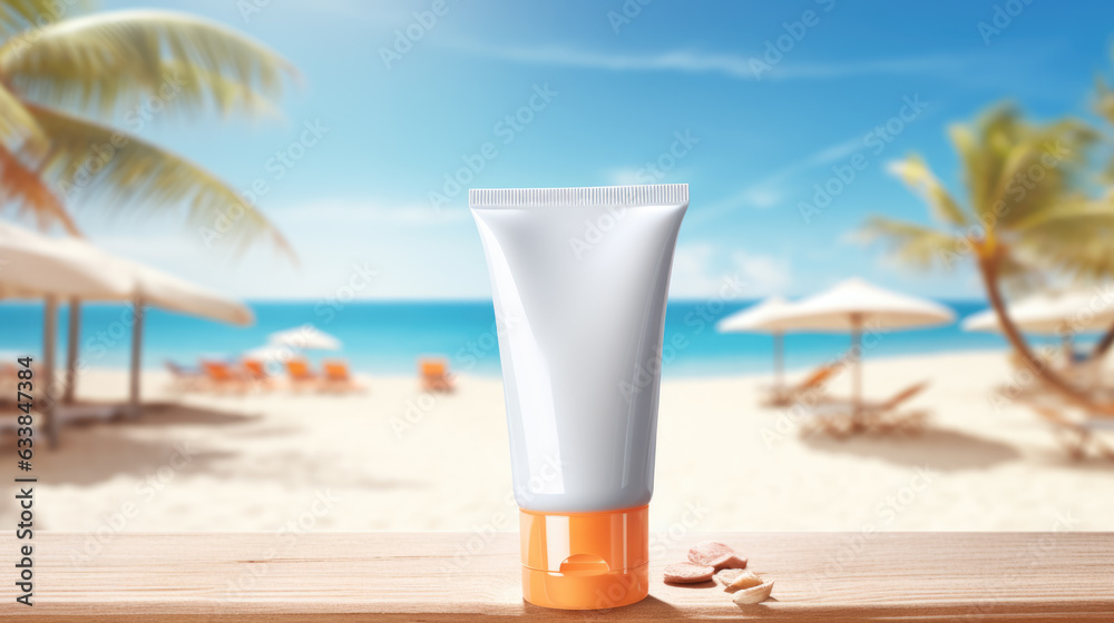 Suntan cream tube on a beach. Sunscreen, sun protection lotion. Skin ...