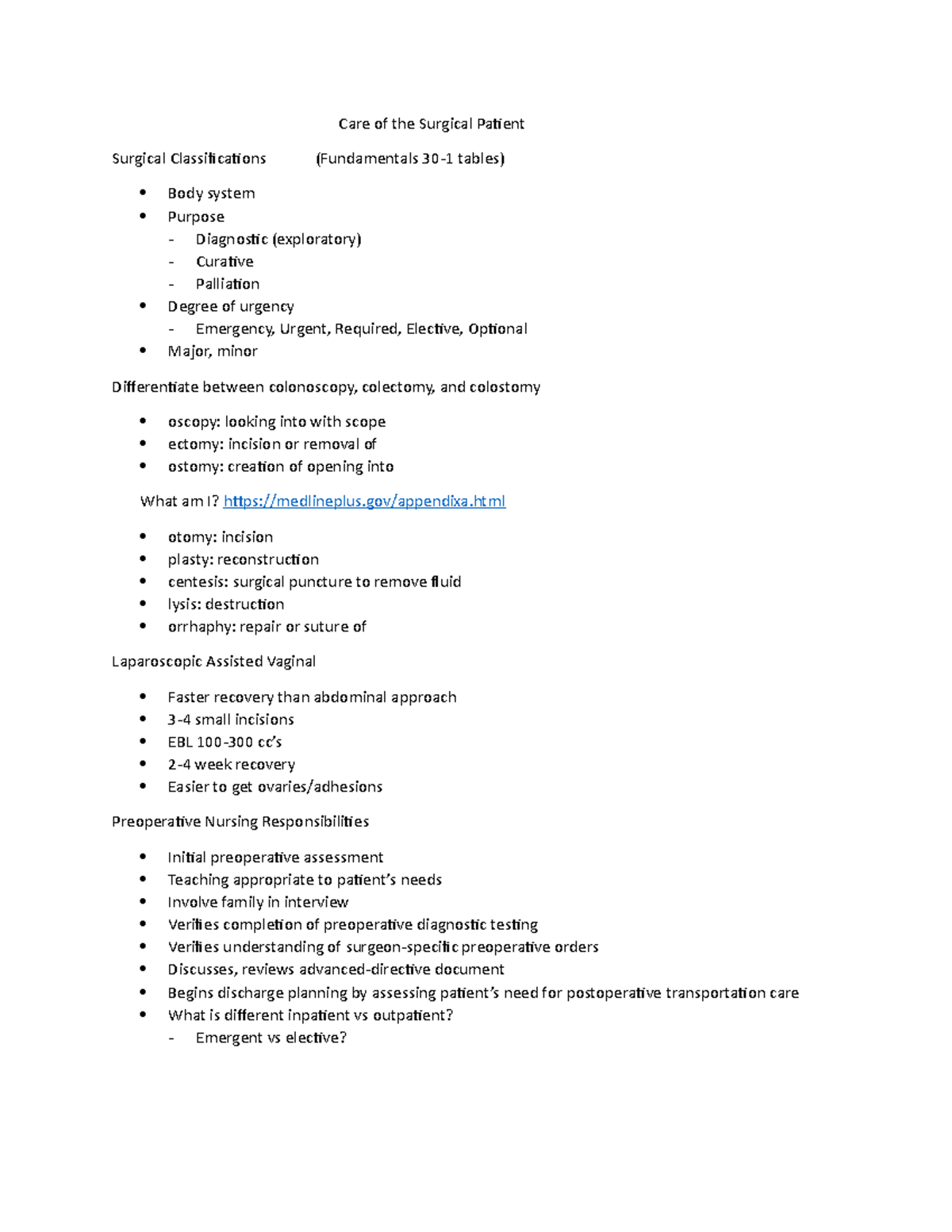 Surgery - Care of the Surgical Patient Surgical Classifications ...