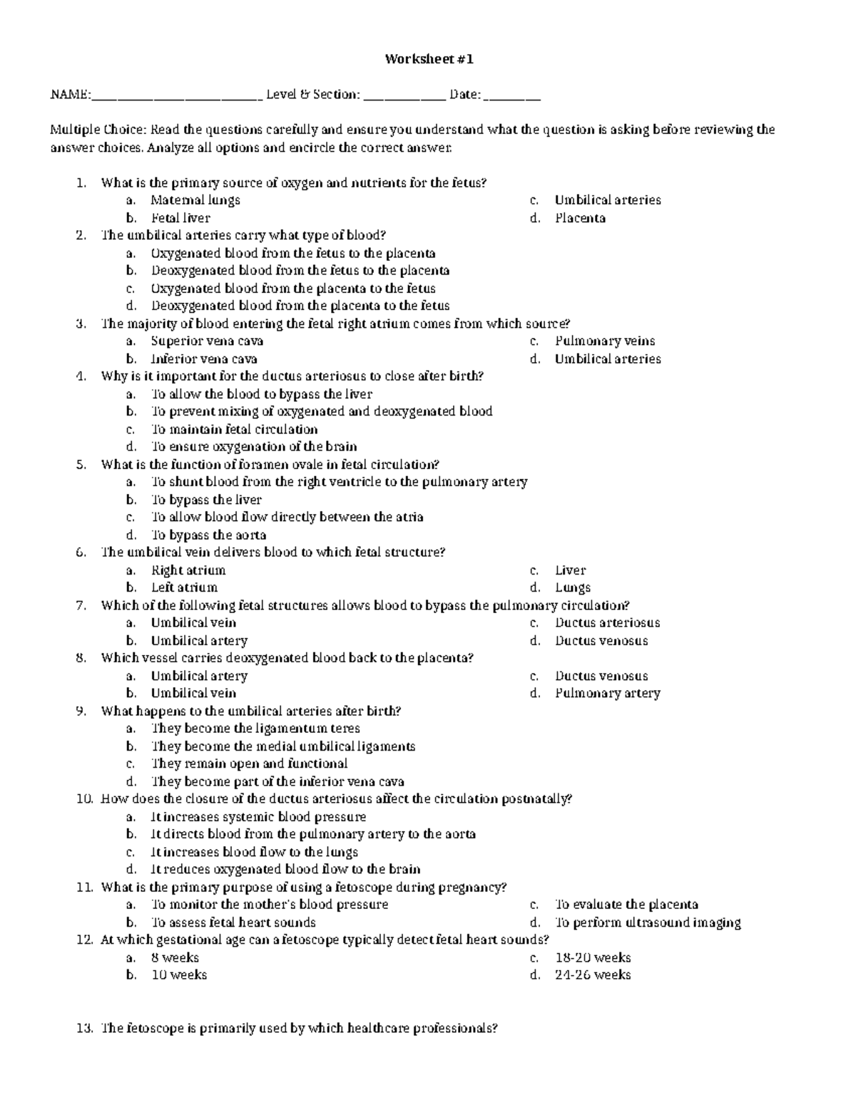 Worksheet Level 1: Fetal Circulation MCQs and Answers - Studocu