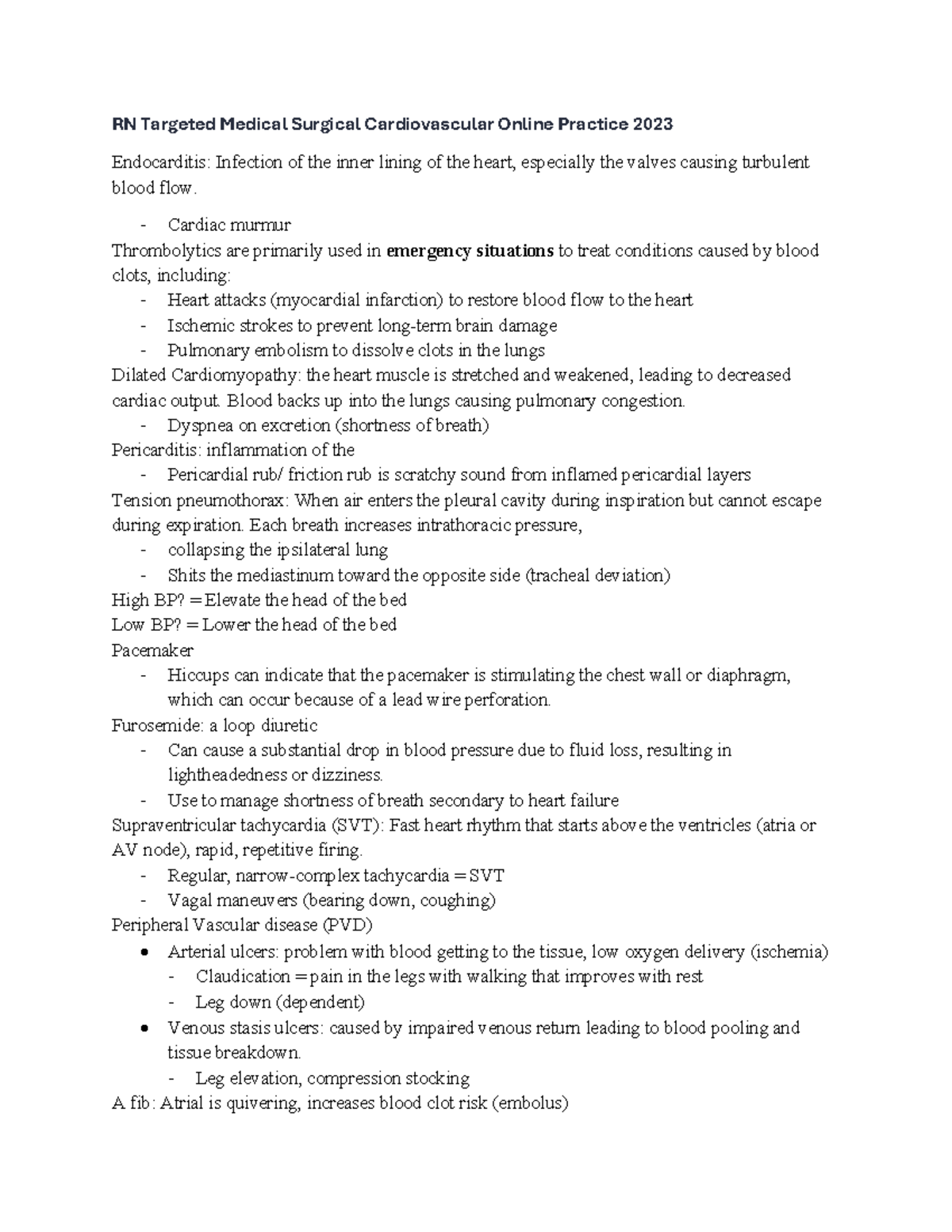 RN Targeted Medical Surgical Cardiovascular Notes 2023 - Studocu