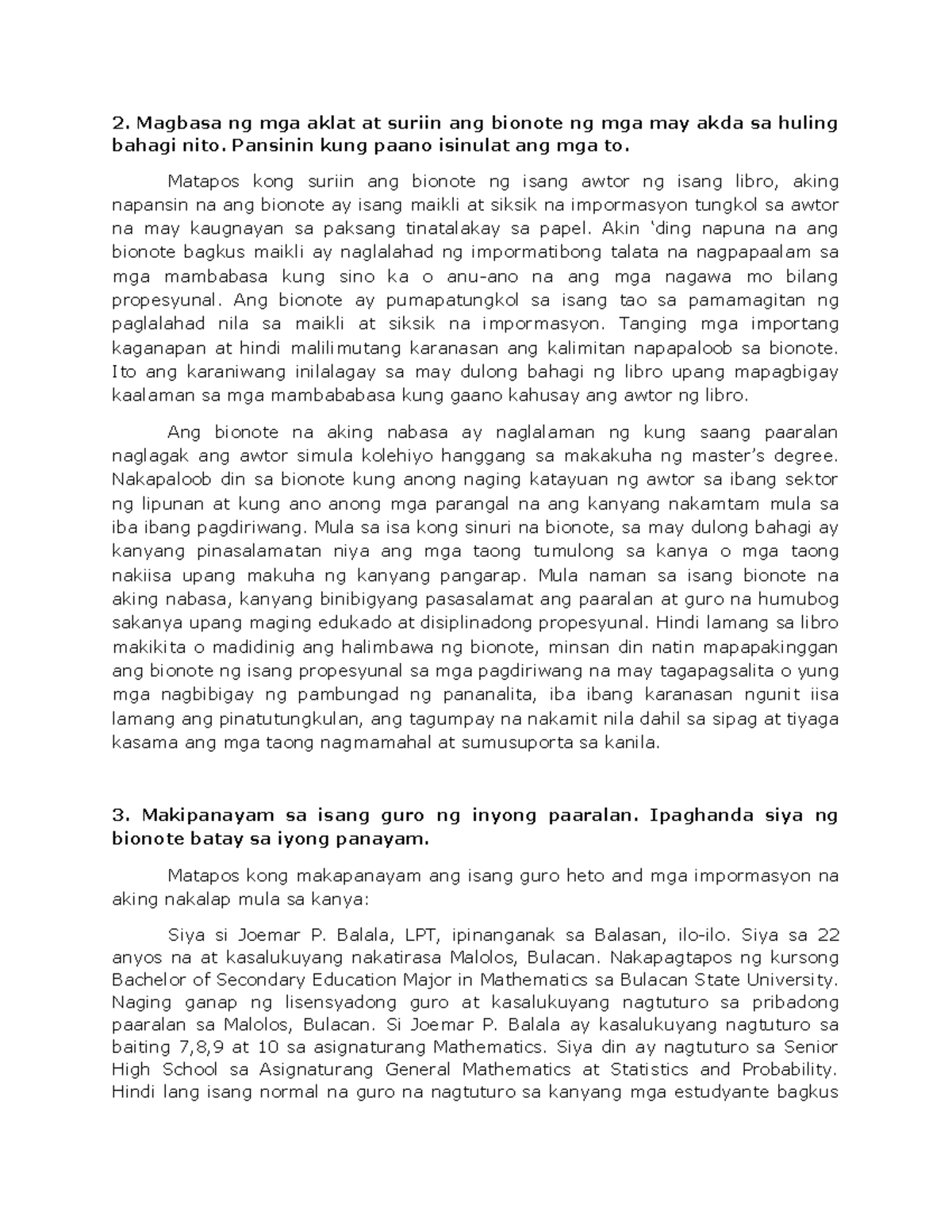 Bionote Final - 2. Magbasa ng mga aklat at suriin ang bionote ng mga ...