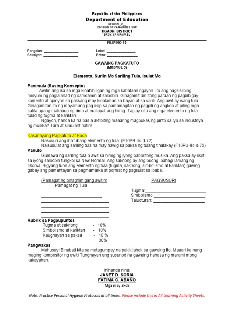 Department of Education: Elemento, Suriin Mo Sariling Tula, Isulat Mo ...