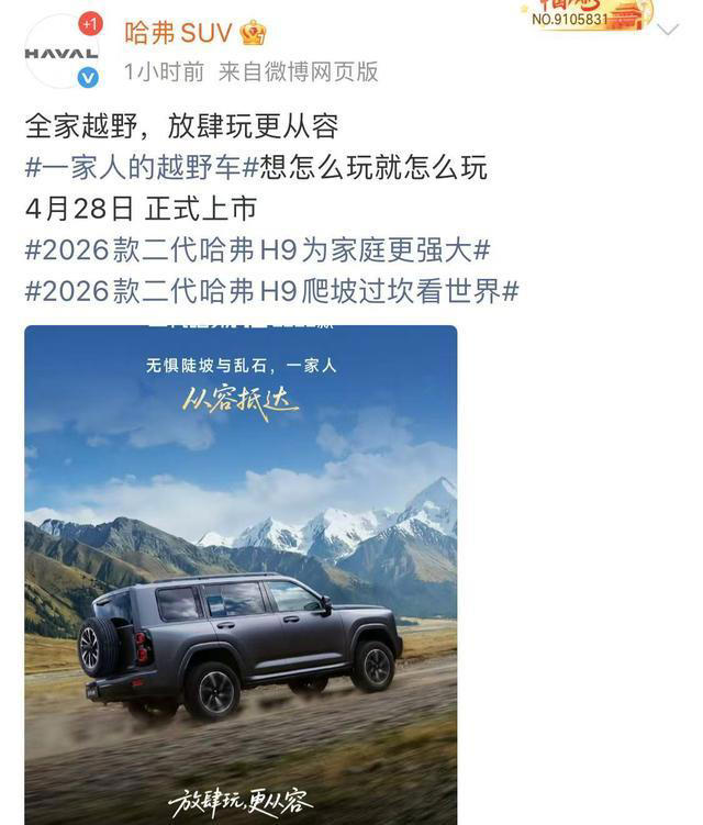 车姿升高/全系2.5吨牵引资质 2026款二代哈弗H9将于4月28日上市
