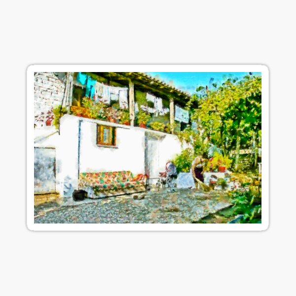 "House exterior with sofa and woman sweeping" Sticker for Sale by ...