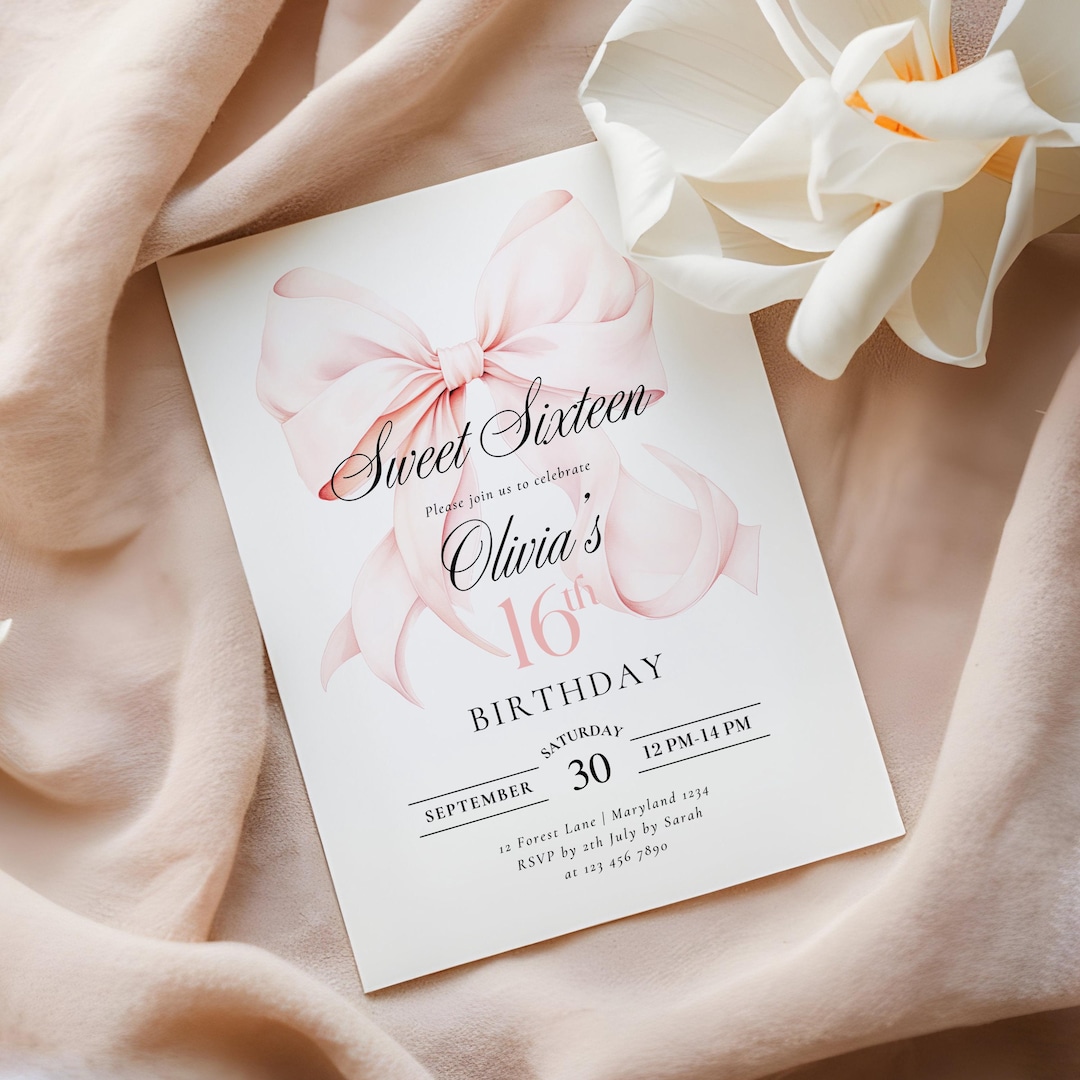 Sweet 16 Invitation, Coquette Invitation, Pink Bow Birthday Invitation ...