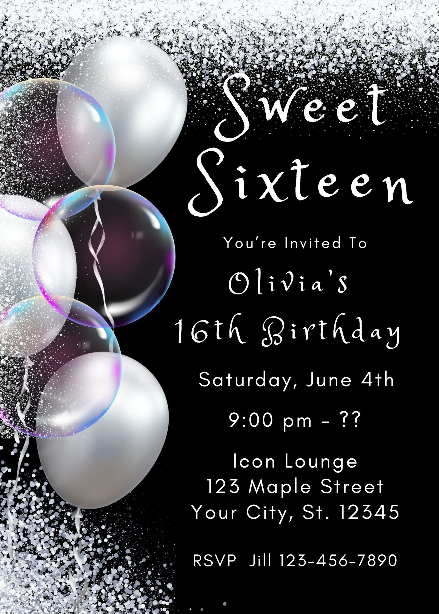 Editable Sweet 16 Birthday Invitation Template Silver and Black ...