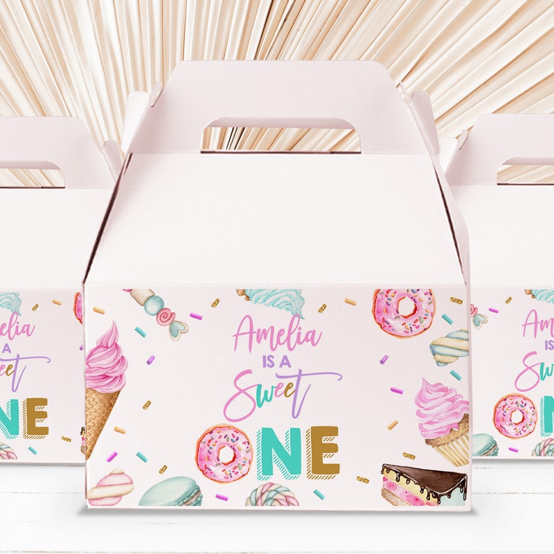 EDITABLE Sweet One Gable Gift Box Label, Donut Birthday Party Favor Box ...