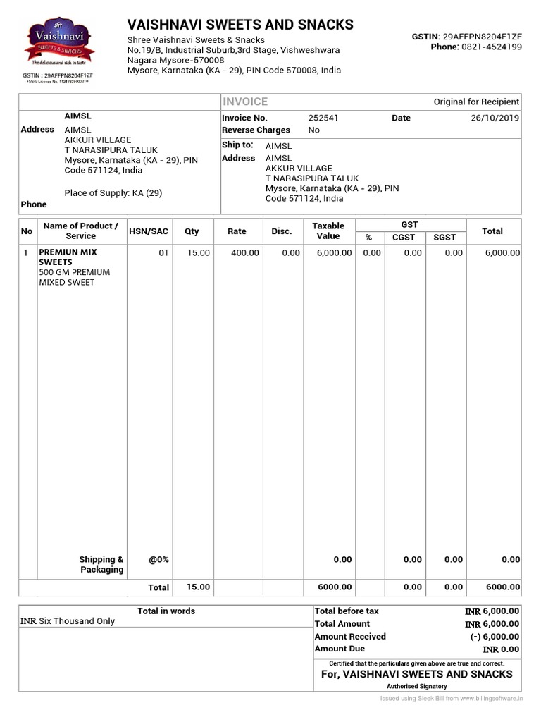 Invoice for the Sale of 500g Premium Mixed Sweets from Vaishnavi Sweets ...