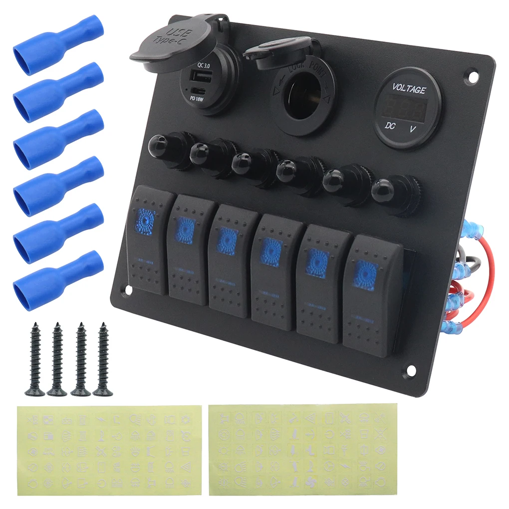 6 Gang Marine Rocker Switch Panel With Circuit Breaker PD USB Socket V ...