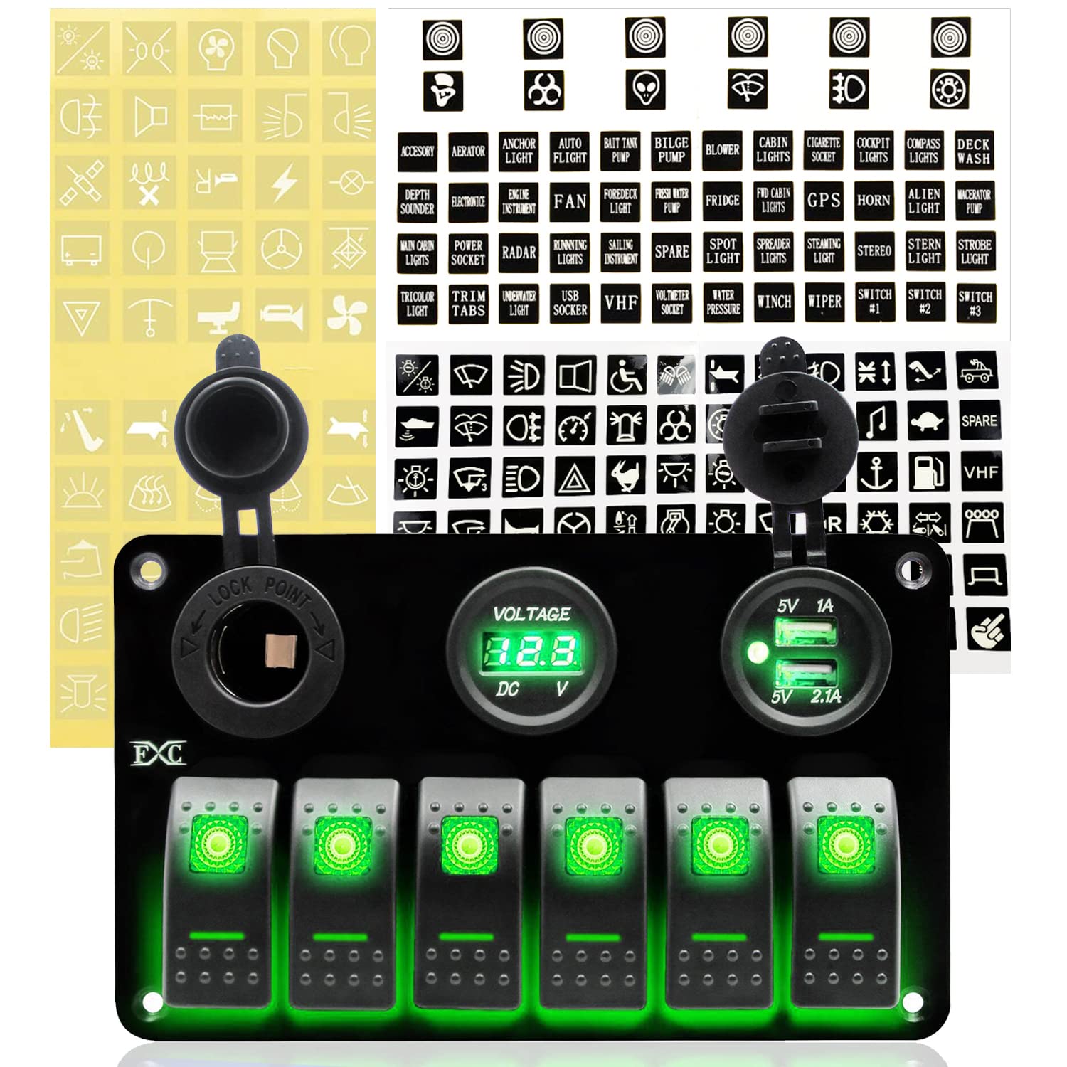 FXC 12 Volt Aluminum Marine Boat Rocker Switch Panel Waterproof 6 Gang ...