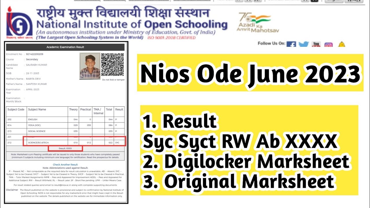Nios June Ode Result Syc Syct XXXX Ab Digilocker Marksheet Original ...