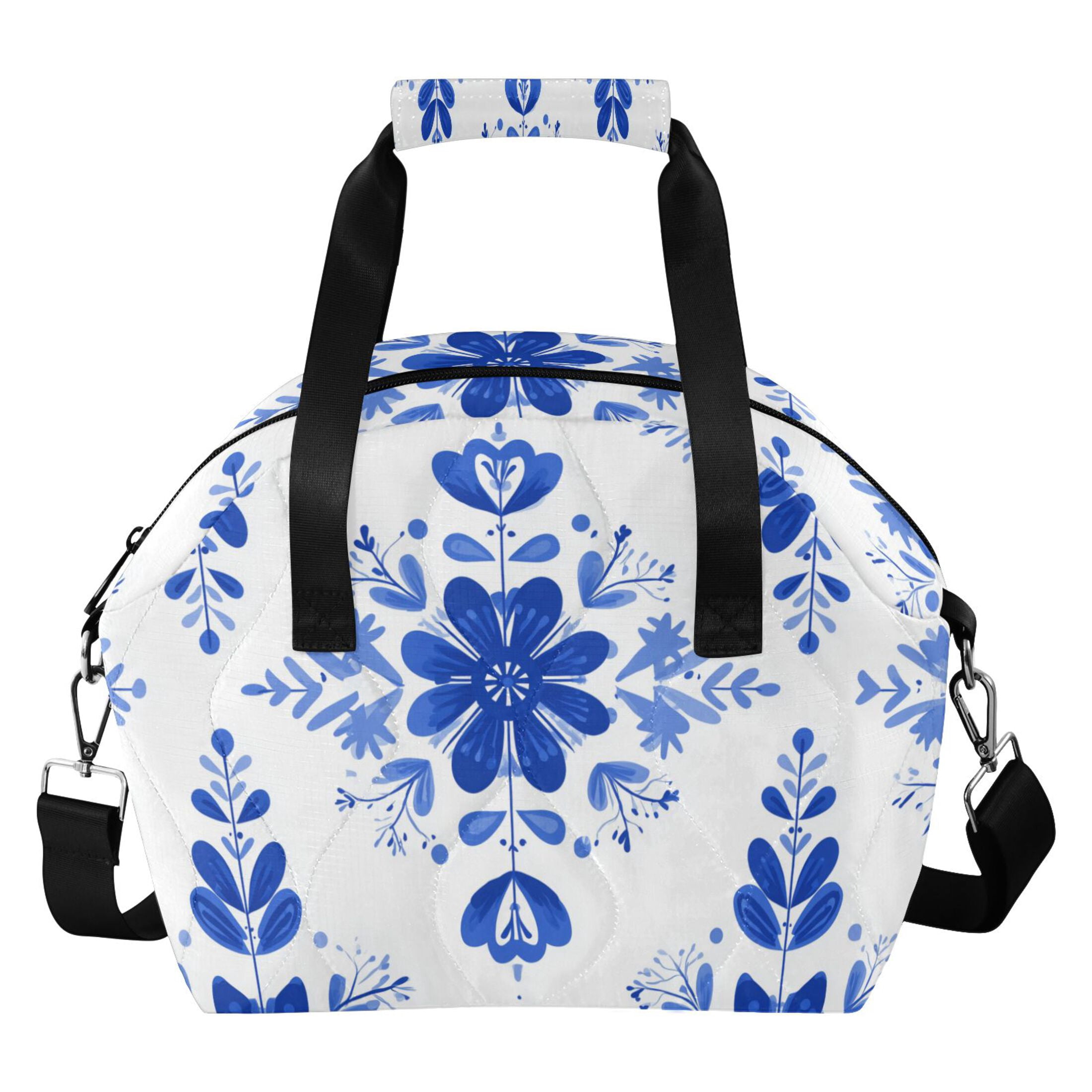 Blue Flowers with Leaves Symmetrical Pattern Insulated Lunch Bag ...