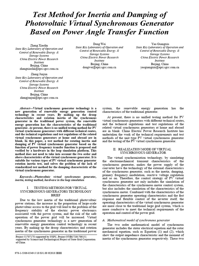 Test Method For Inertia and Damping of Photovoltaic Virtual Synchronous ...