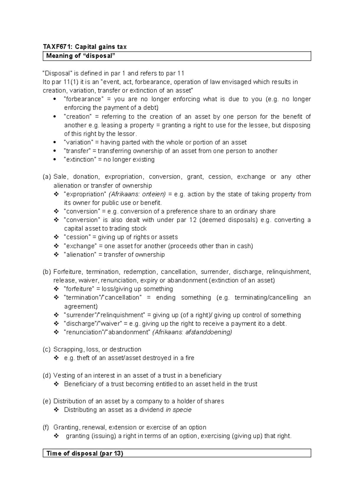 TAXF671: Summary of Capital Gains Tax Disposal Events and Timing - Studocu