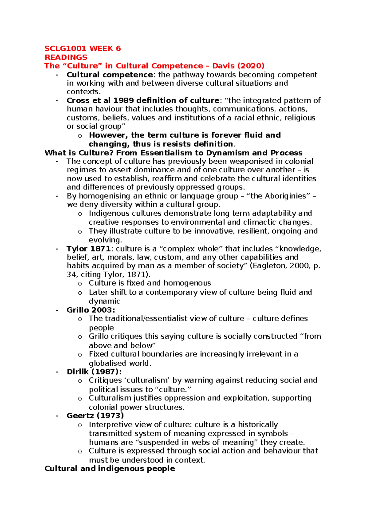 SCLG1001 WEEK 6 - Cultural Competence Lecture & Readings Summary - Studocu