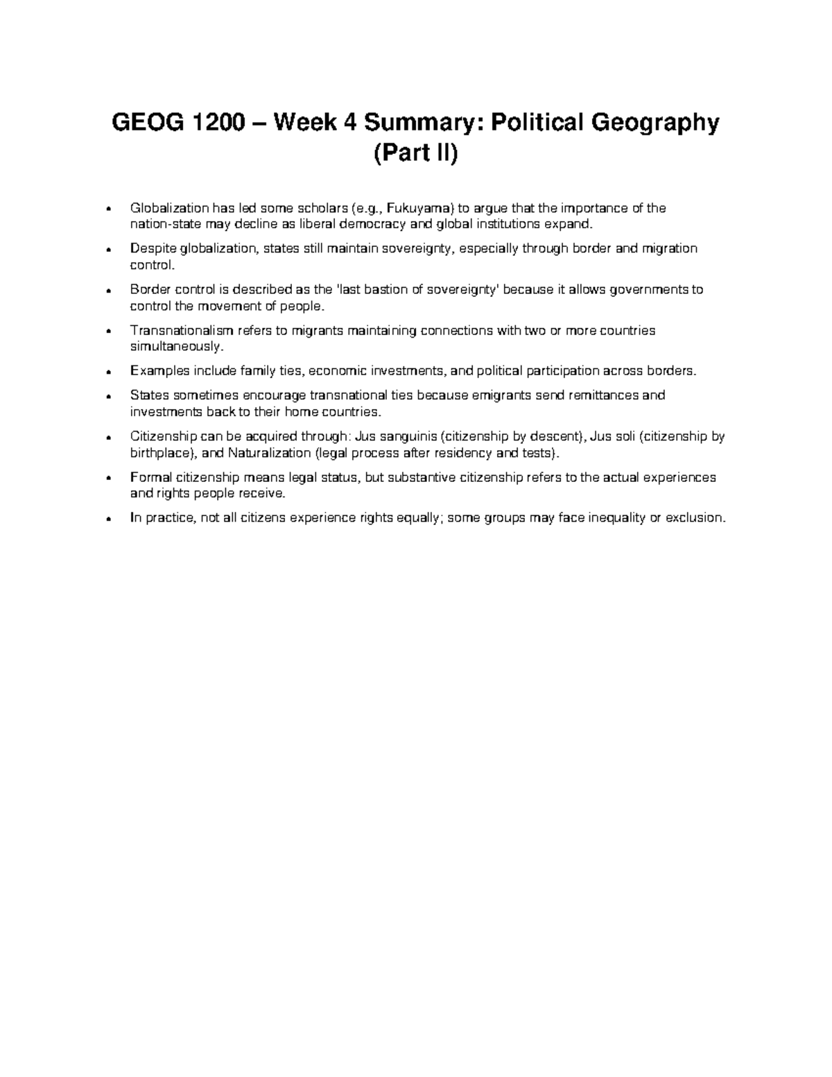 GEOG 1200 Week 4 Summary: Political Geography & Transnationalism - Studocu