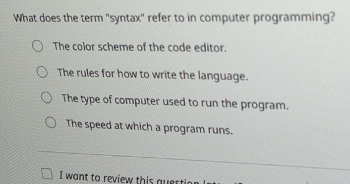 Solved: What does the term 'syntax" refer to in computer programming ...