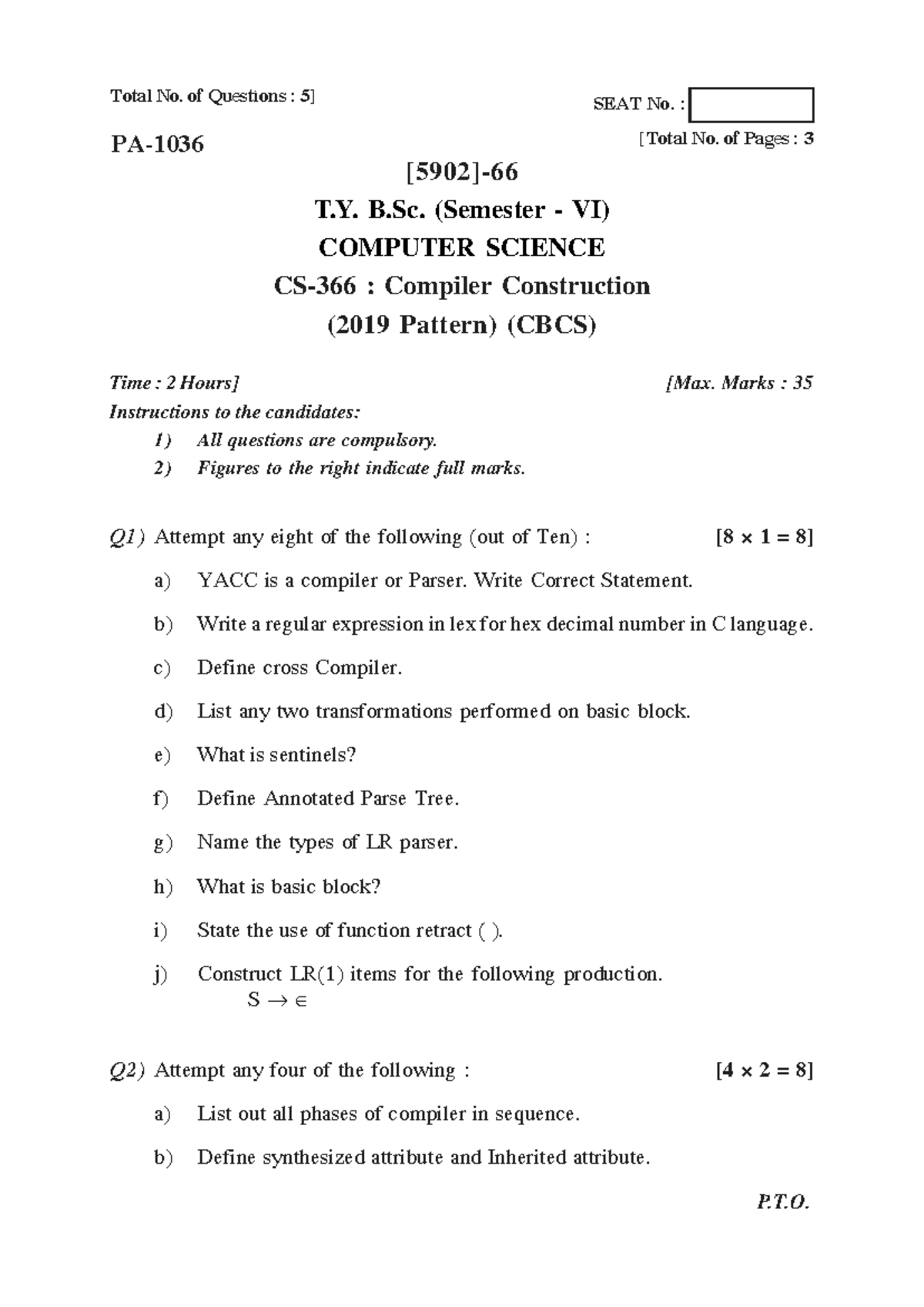 T.Y. B.Sc. (Sem VI) Computer Science: Compiler Construction Exam Q&A ...