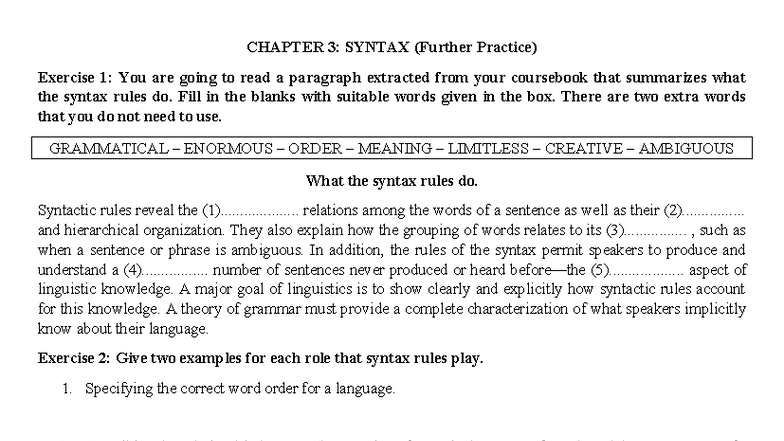CHAPTER 3: SYNTAX (Further Practice) - Exercises & Tree Diagrams - Studocu