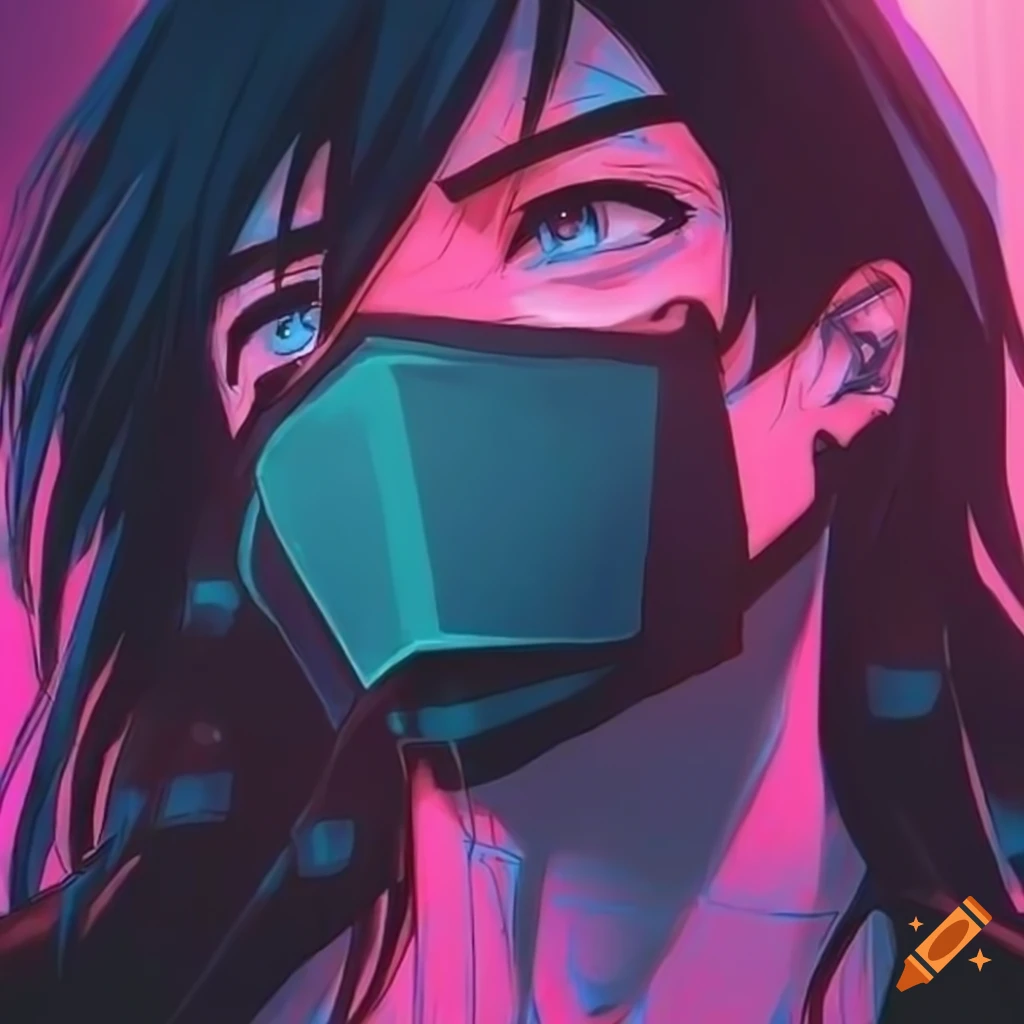 Sunset synthwave with anime male wearing mask and long black hair on ...