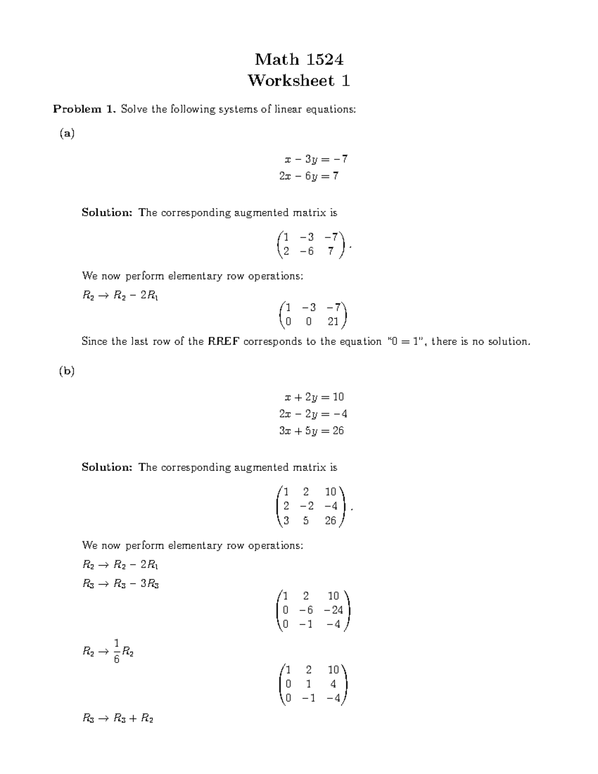 MATH 1524 Worksheet 1: Solving Systems of Linear Equations - Studocu