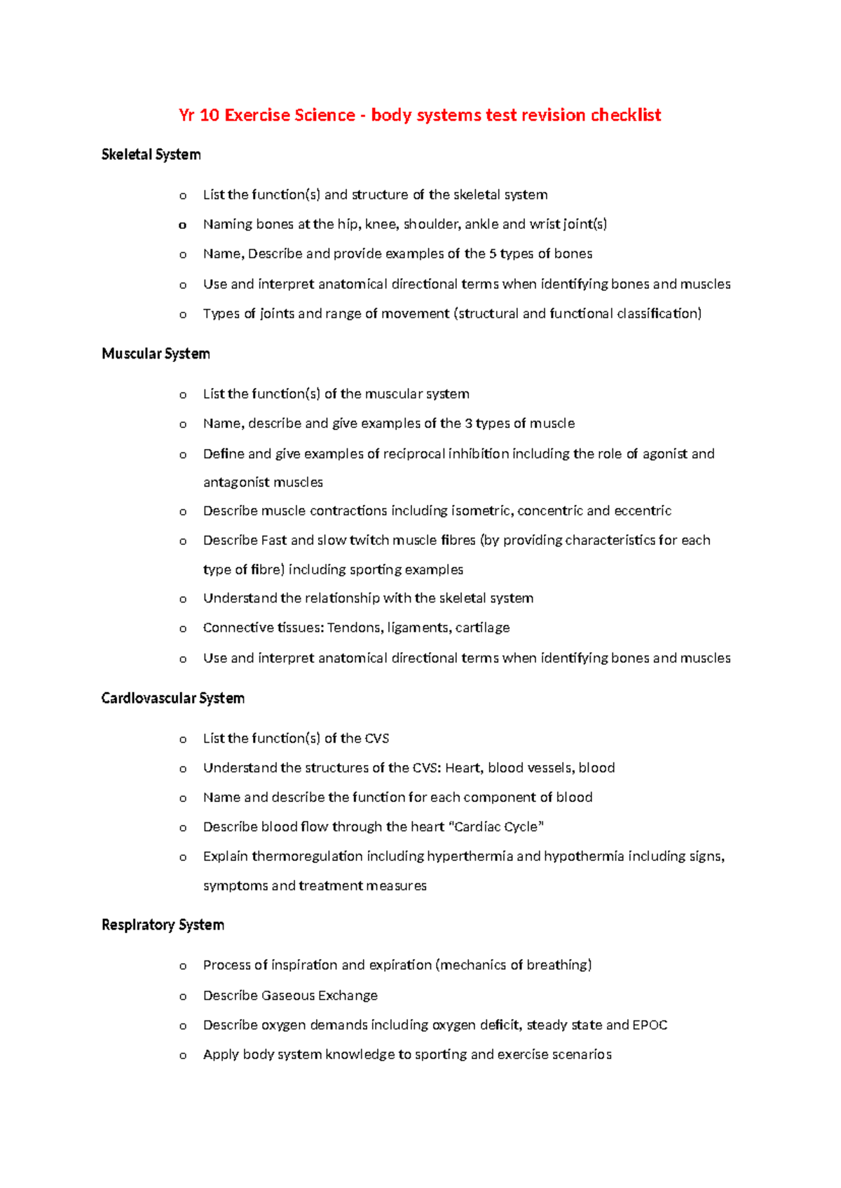 2026 Yr 10 Exercise Science Body Systems Revision Checklist - Studocu