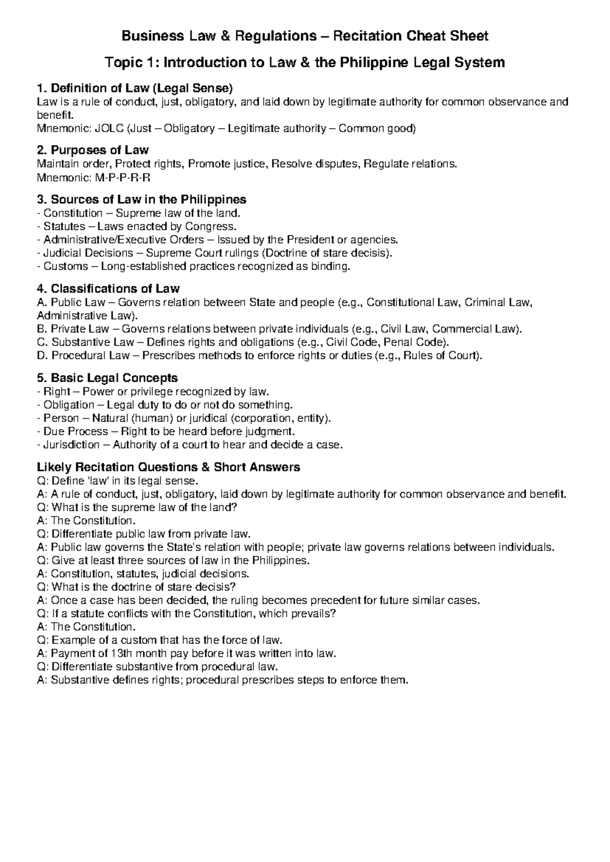 BUS 101 Recitation Cheat Sheet: Intro to Philippine Legal System - Studocu