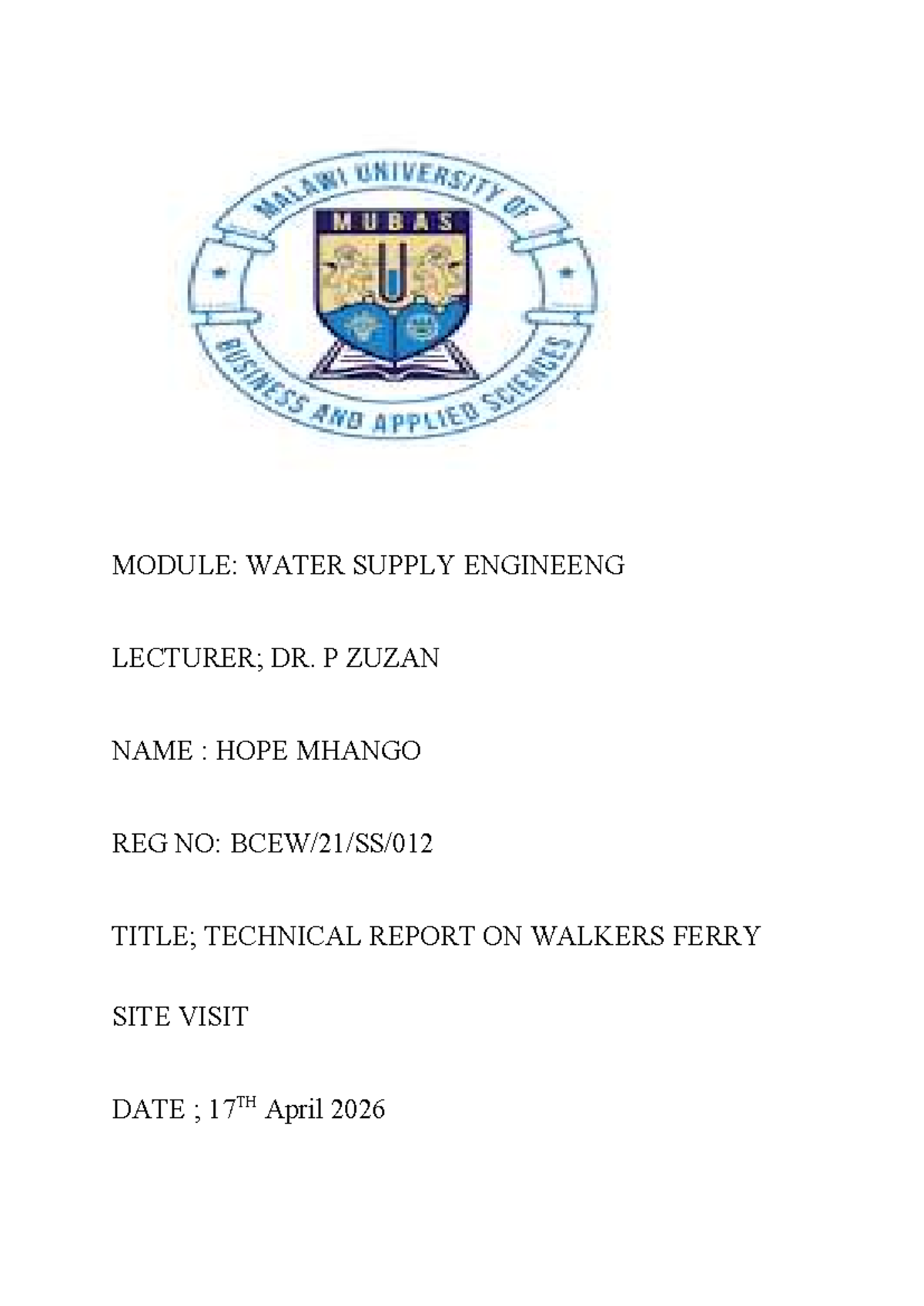 TECH REPORT: WATER SUPPLY SYSTEM AT WALKERS FERRY (ENG 101) - Studocu