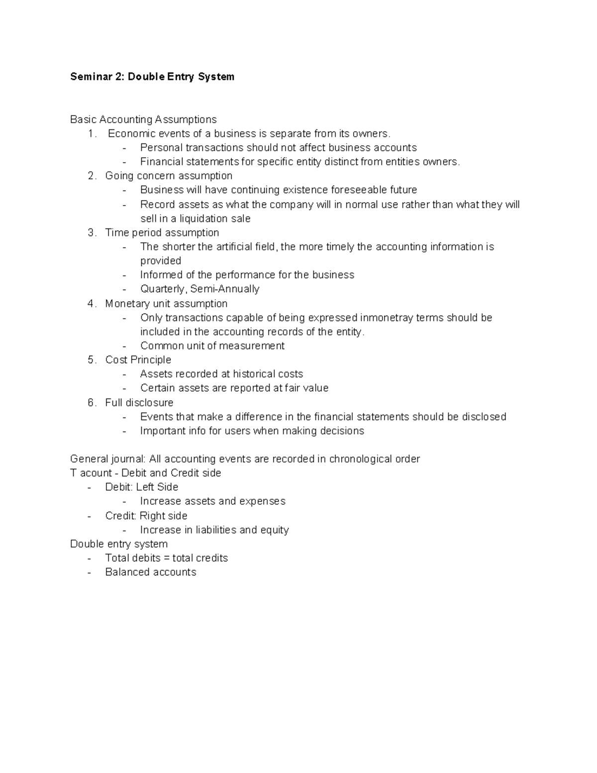FA Seminar - Accounting Notes: Double Entry System & Assumptions - Studocu